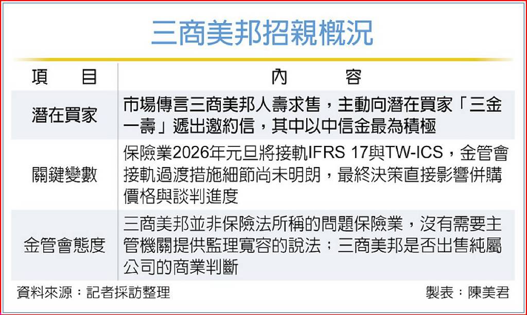 近期市場傳出重磅消息,資本不足的三商美邦人壽求售,主動向潛在買家「三金一壽」遞出邀約信,不過,保險業2026年元旦將接軌IFRS 17與TW-ICS,目前金管會接軌過渡措施細節尚未明朗,監理政策彈性將直接影響併購價格與談判進度。金管會擬修正的「過渡措施」恐成為這場婚事成敗關鍵。