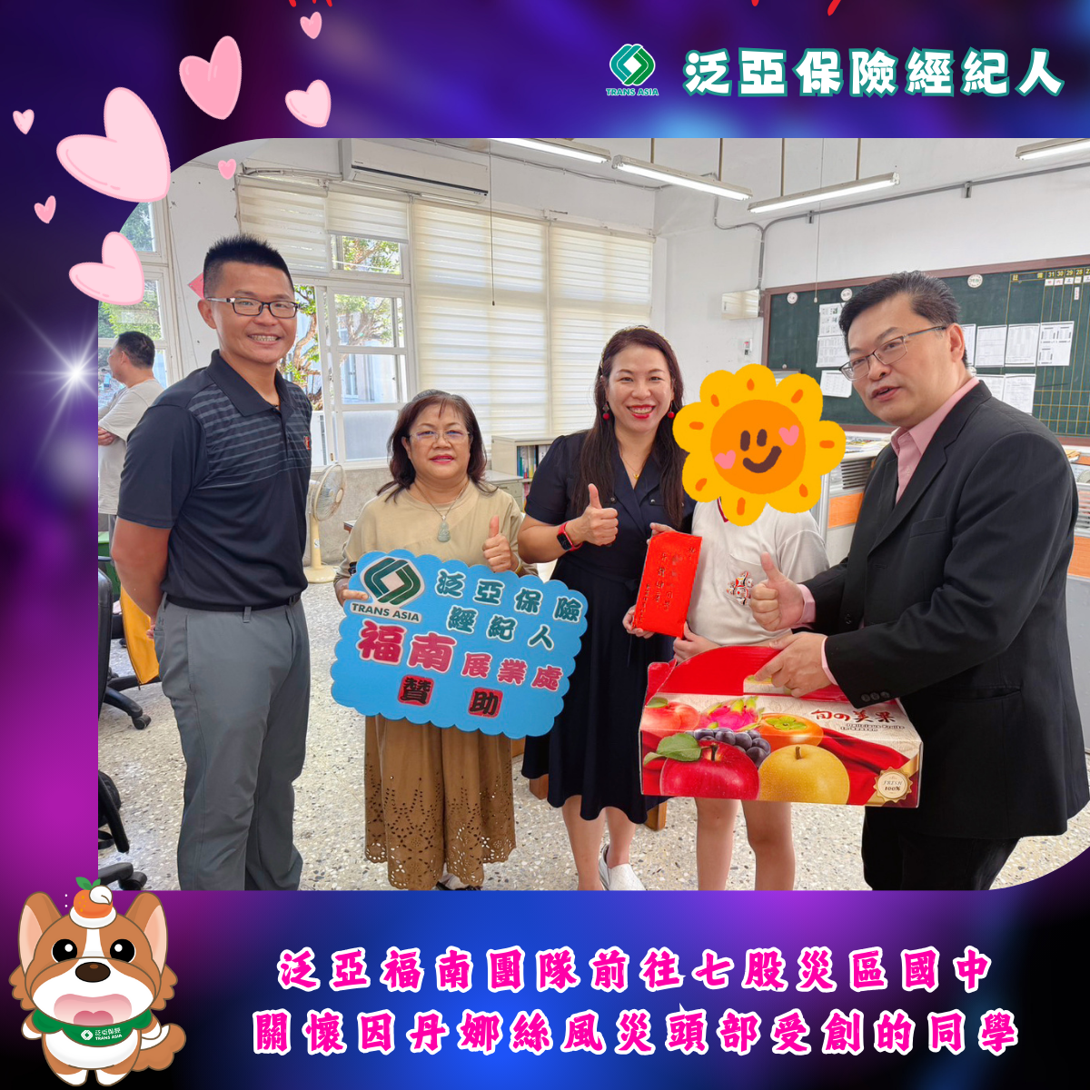 🌟 社會公益|#關懷丹娜絲風災受傷學子 人飢己飢,人溺己溺 此刻,我們都是台南人💛 丹娜絲颱風重創南台灣,雲嘉南沿海更是首當其衝。其中O同學在此次風災,頭部不幸遭受嚴重傷害,歷經開顱手術後保住性命,但未來復健與臉部醫美費用,對於家裡仍是沉重壓力。 在得知此事後,福南展業處鄭麗琪副總經理立即號召愛心,並於七夕情人節當天,將泛亞保經福南團隊的關懷與支持,親自送到O同學身邊。🤝 願這份溫暖,陪伴O同學走過艱難時刻, 也誠心祝福他早日康復,平安健康, 未來的日子能重新綻放笑容。🌈✨